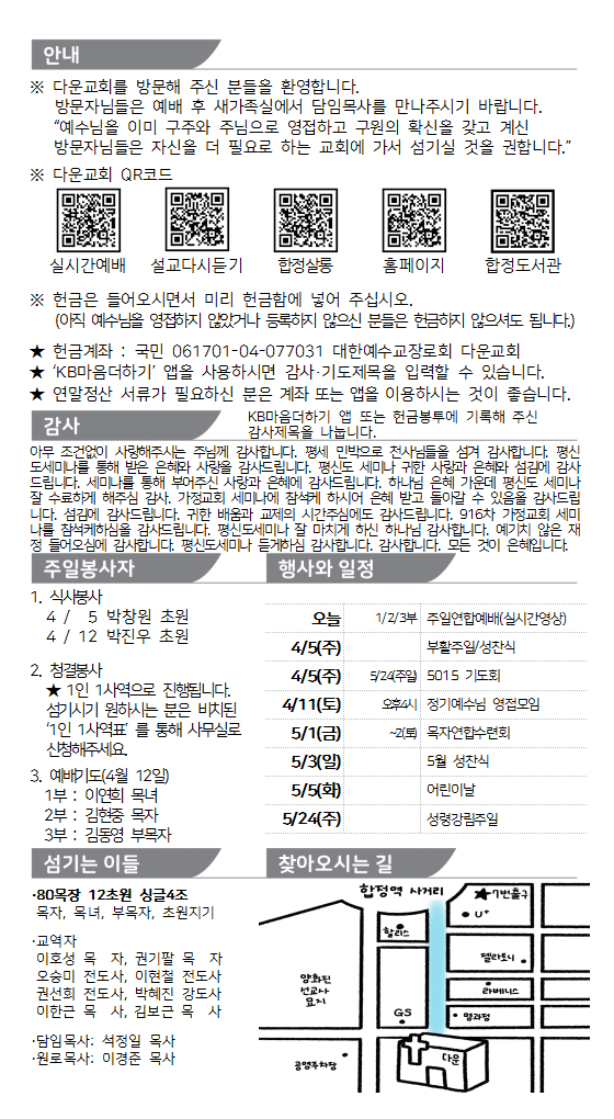 교회주보는 큐알코드로 이용하실 수 있습니다. 본당입구, 본당 접이식테이블, 주보에 있는 “다운교회 QR코드”와 다운교회 홈페이지 나눔터에 있는 “주보와 교회소식”에서 확인할 수 있습니다.