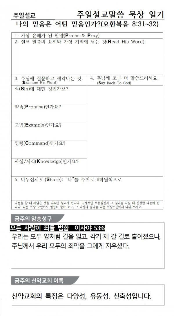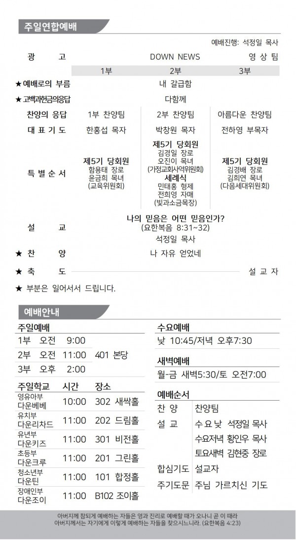 * 교회주보는 큐알코드로 이용하실 수 있습니다. 본당입구, 본당 접이식테이블, 주보에 있는 “다운교회 QR코드”와 다운교회 홈페이지 나눔터에 있는 “주보와 교회소식”에서 확인할 수 있습니다.