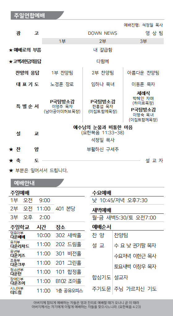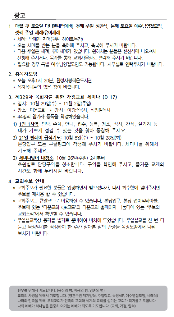 * 교회주보는 큐알코드로 이용하실 수 있습니다. 본당입구, 본당 접이식테이블, 주보에 있는 “다운교회 QR코드”와 다운교회 홈페이지 나눔터에 있는 “주보와 교회소식”에서 확인할 수 있습니다.
