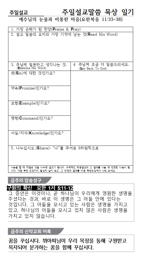 * 주일설교묵상 용지를 별지로 준비하여 비치해 두었습니다. 주일설교를 한 번 더 듣고 묵상일기를 작성하여 한 주간 살아본 삶의 간증을 목장모임에서 나눠 보시기 바랍니다.