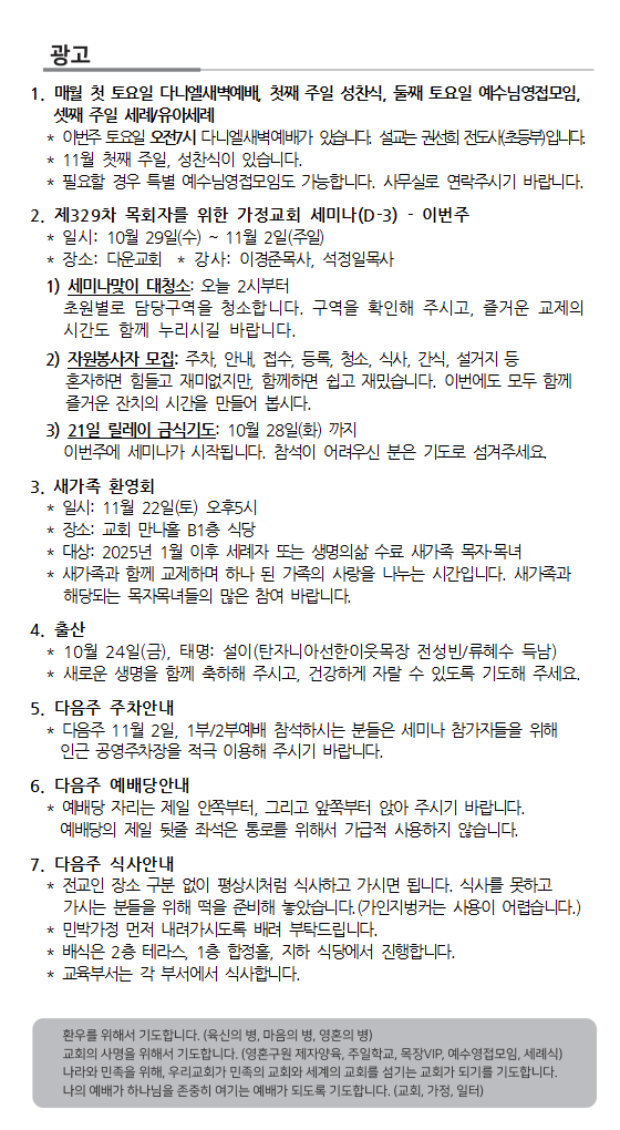 * 다음주 11월 2일, 1부/2부예배 참석하시는 분들은 세미나 참가자들을 위해 인근 공영주차장을 적극 이용해 주시기 바랍니다.
