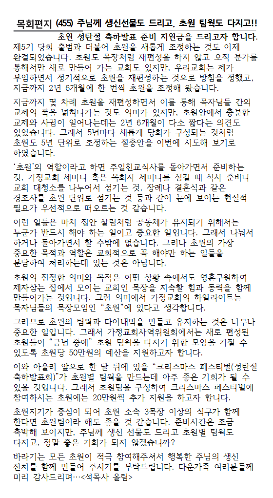 * 올해 크리스마스에는 예수님의 탄생을 기뻐하며 가족, 목장, 초원, 각 부서 공동체가 함께하여 VIP와 이웃에게 사랑을 나누고 전하는 행복한 통로가 되길 바랍니다.