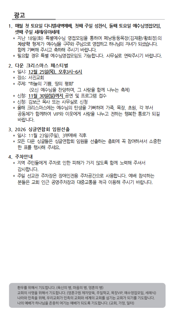 * 필요할 경우 특별 예수님영접모임도 가능합니다. 사무실로 연락주시기 바랍니다.