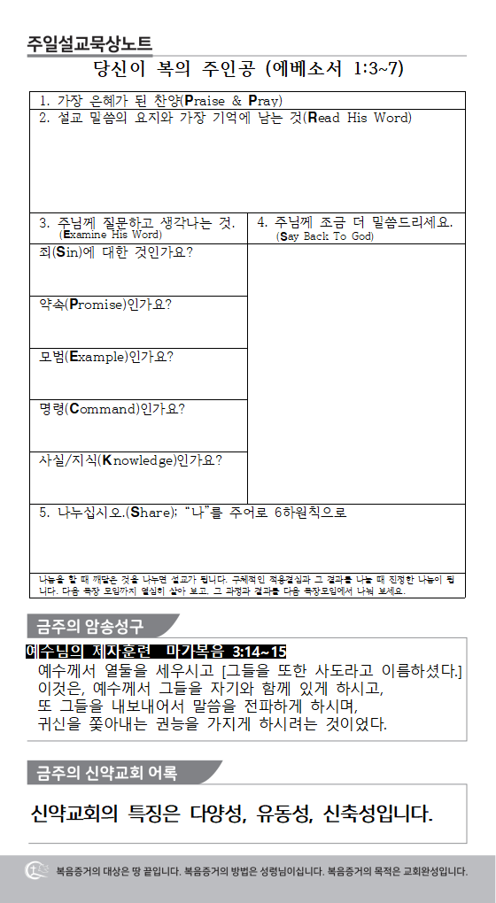 · 대상: 생명의삶을 수료하고 예수님을 영접한 목장식구
