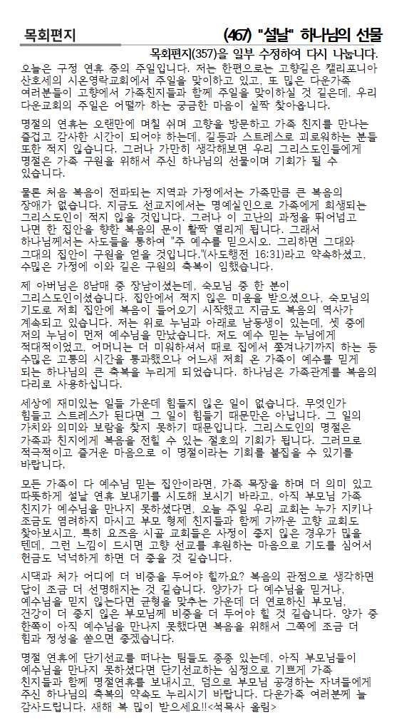 온 가족이 함께 예배를 드리며 사랑과 감사로 채워가는 풍성한 명절을 보내시길 바랍니다.