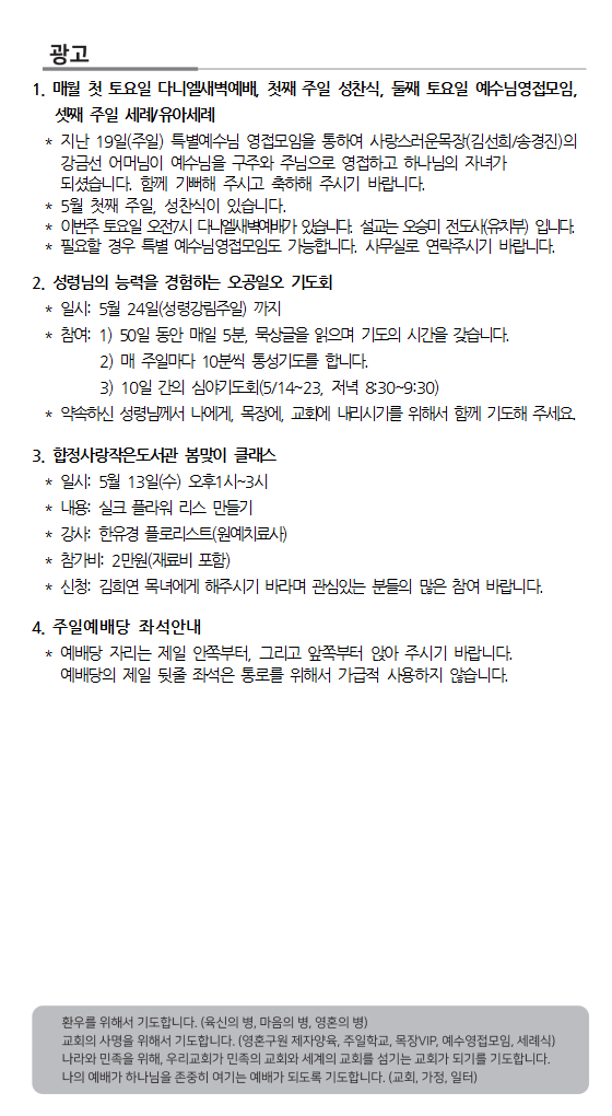 1. 매월 첫 토요일 다니엘새벽예배, 첫째 주일 성찬식, 둘째 토요일 예수님영접모임, 셋째 주일 세례/유아세례